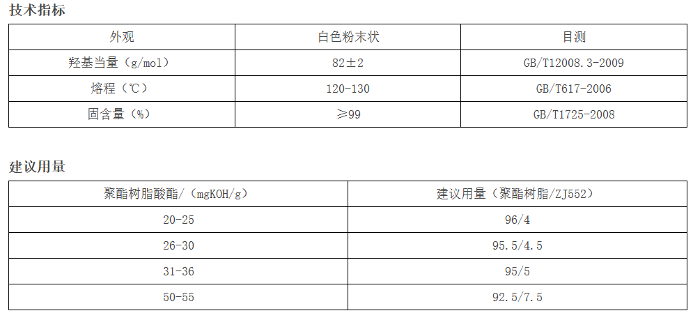 ZJ552的化學成份是β-羥烷基酰胺(俗稱HAA),是一種良好的耐候性粉末涂料固化劑,具有低毒性、用量少、固化溫度低的優(yōu)點,可替代TGIC環(huán)保型粉末涂料。