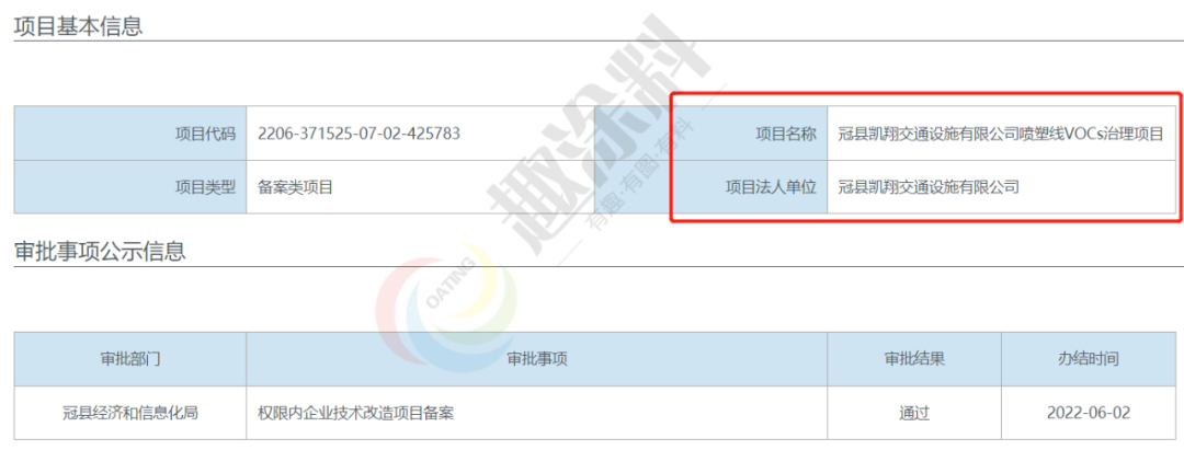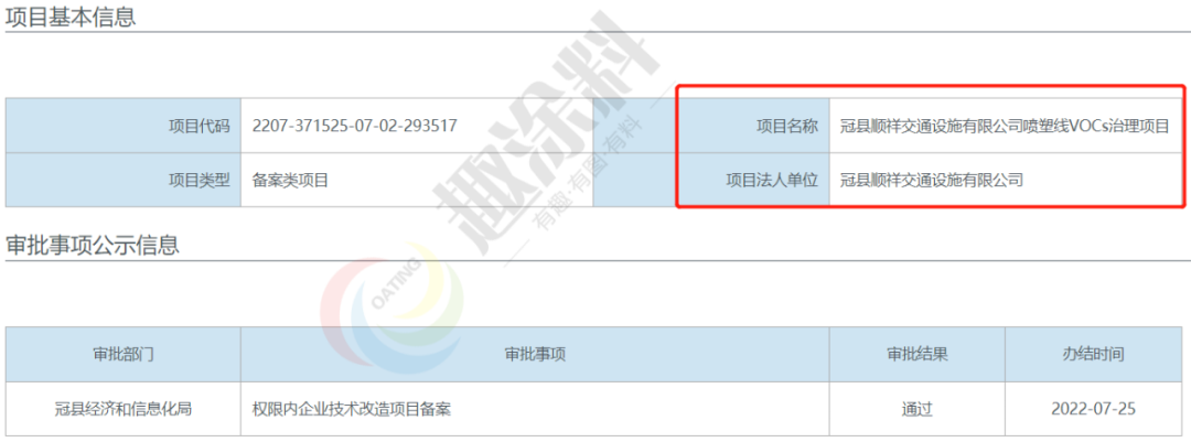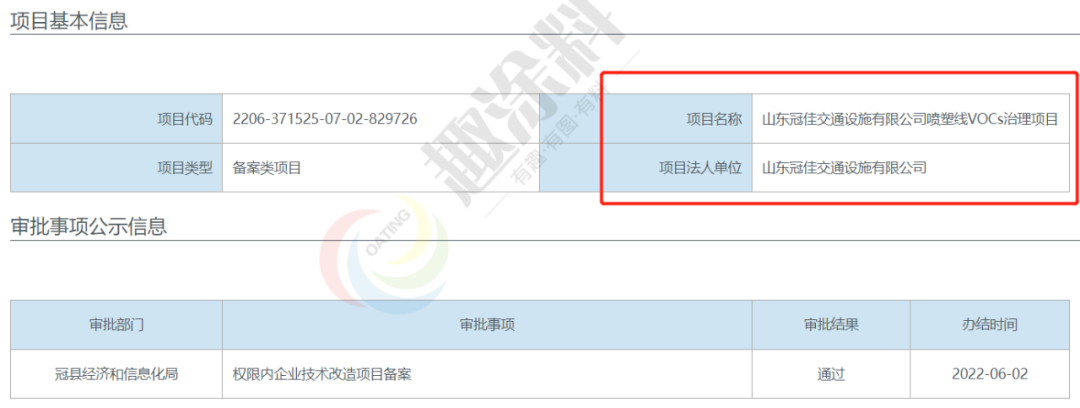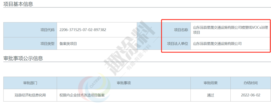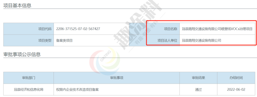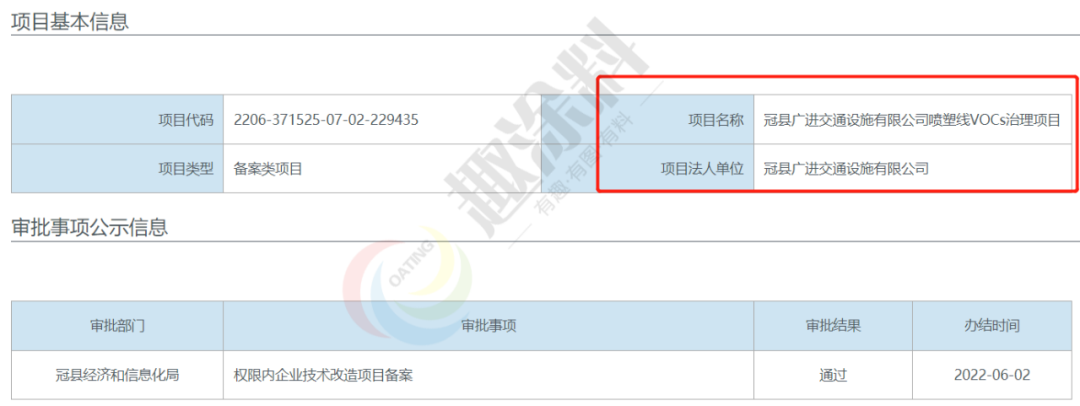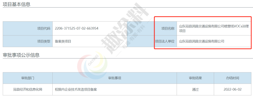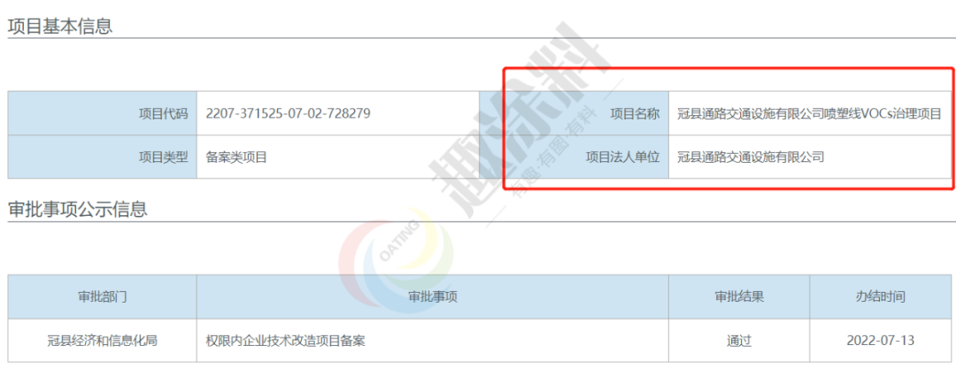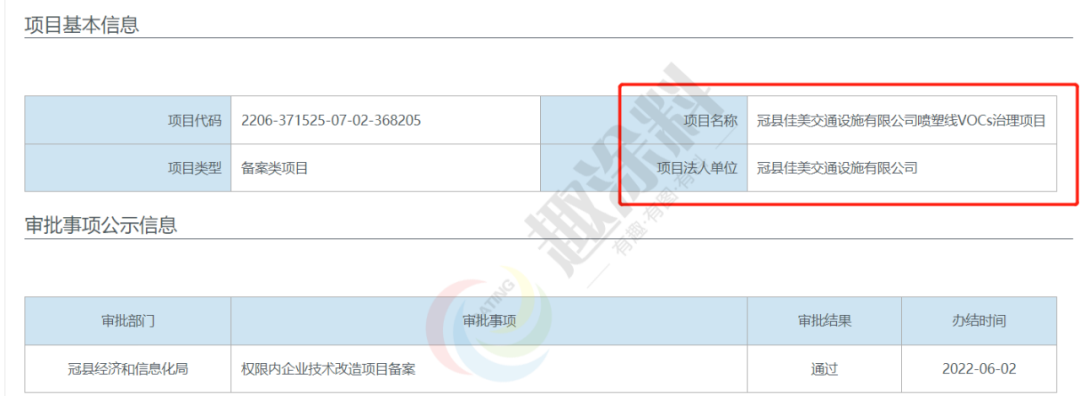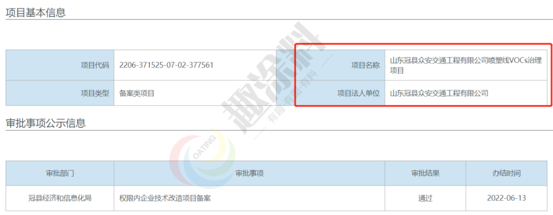 2022年6月13日,山東冠縣眾安交通工程有限公司,噴塑線VOCs治理項(xiàng)目,在冠縣經(jīng)濟(jì)和信息化局,進(jìn)行權(quán)限內(nèi)企業(yè)技術(shù)改造項(xiàng)目備案。
