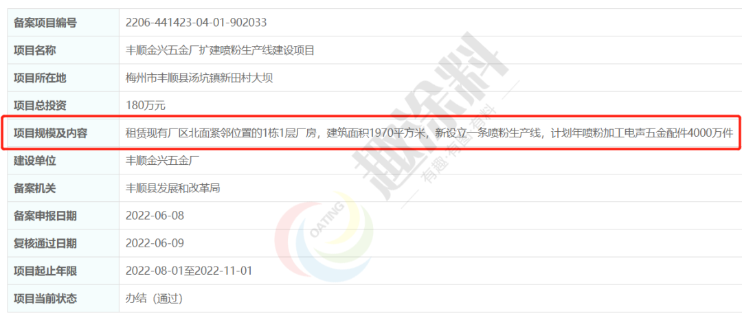 2022年6月9日,豐順金興五金廠,擴(kuò)建噴粉生產(chǎn)線建設(shè)項(xiàng)目,在豐順縣發(fā)展和改革局,進(jìn)行企業(yè)項(xiàng)目備案。