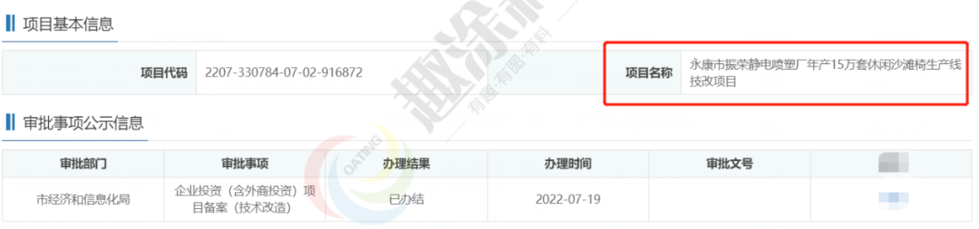 2022年7月19日,永康市振榮靜電噴塑廠,年產(chǎn)15萬(wàn)套休閑沙灘椅生產(chǎn)線技改項(xiàng)目,在市經(jīng)濟(jì)和信息化局,進(jìn)行企業(yè)投資(含外商投資)項(xiàng)目備案(技術(shù)改造)。
