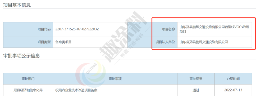 2022年7月13日,山東省冠縣鵬輝交通設(shè)施有限公司,噴塑線VOCs治理項(xiàng)目,在冠縣經(jīng)濟(jì)和信息化局,進(jìn)行權(quán)限內(nèi)企業(yè)技術(shù)改造項(xiàng)目備案。