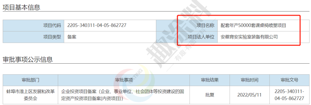 2022年5月11日,安徽育安實(shí)驗(yàn)室裝備有限公司,配套年產(chǎn)50000套課桌椅噴塑項(xiàng)目,在蚌埠市淮上區(qū)發(fā)展和改革委員會(huì),進(jìn)行企業(yè)投資項(xiàng)目備案。