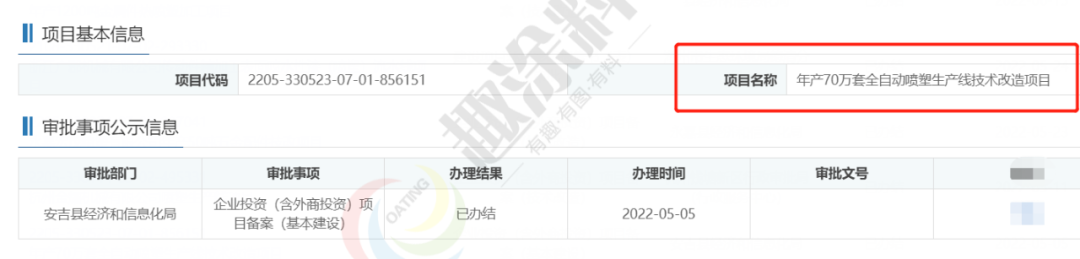 2022年5月7日,浙江安吉惠業(yè)家具有限公司,年產(chǎn)70萬(wàn)套全自動(dòng)噴塑生產(chǎn)線技術(shù)改造項(xiàng)目,在安吉縣經(jīng)濟(jì)和信息化局,進(jìn)行企業(yè)投資(含外商投資)項(xiàng)目備案(基本建設(shè))。