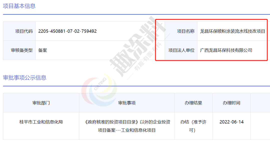 2022年6月14日,廣西龍昌環(huán)??萍加邢薰?,噴粉涂裝流水線技改項(xiàng)目,在桂平市工業(yè)和信息化局,進(jìn)行企業(yè)投資項(xiàng)目備案。