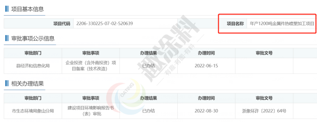 2022年6月15日,寧波亞大金屬表面處理有限公司,年產(chǎn)1200噸金屬件熱噴塑加工項(xiàng)目,在縣經(jīng)濟(jì)和信息化局,進(jìn)行企業(yè)投資(含外商投資)項(xiàng)目備案(技術(shù)改造)。