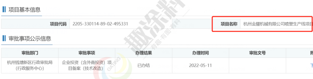 2022年5月11日,杭州金耀機(jī)械有限公司,噴塑生產(chǎn)線項(xiàng)目,在杭州錢塘新區(qū)行政審批局,進(jìn)行企業(yè)投資(含外商投資)項(xiàng)目備案(技術(shù)改造)。