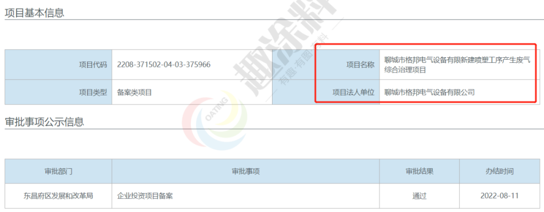2022年8月11日,聊城市格邦電氣設(shè)備有限公司,新建噴塑工序產(chǎn)生廢氣綜合治理項(xiàng)目,在東昌府區(qū)發(fā)展和改革局,進(jìn)行企業(yè)投資項(xiàng)目備案。