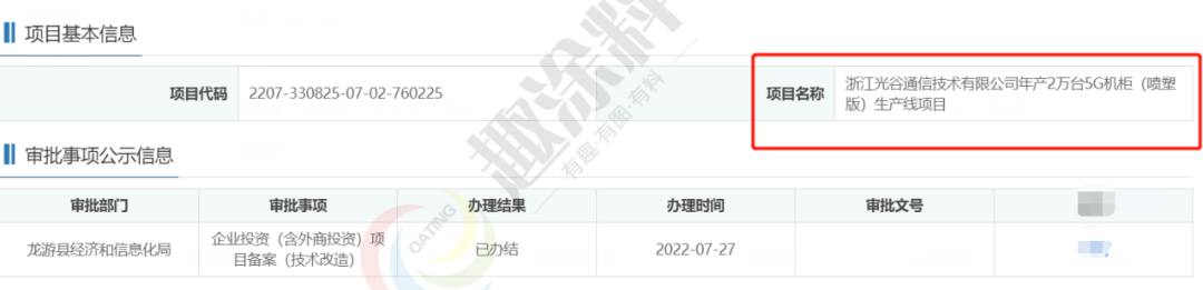 2022年7月27日,浙江光谷通信技術(shù)有限公司,年產(chǎn)2萬(wàn)臺(tái)5G機(jī)柜(噴塑版)生產(chǎn)線項(xiàng)目,在龍游縣經(jīng)濟(jì)和信息化局,進(jìn)行企業(yè)投資(含外商投資)項(xiàng)目備案(技術(shù)改造)。