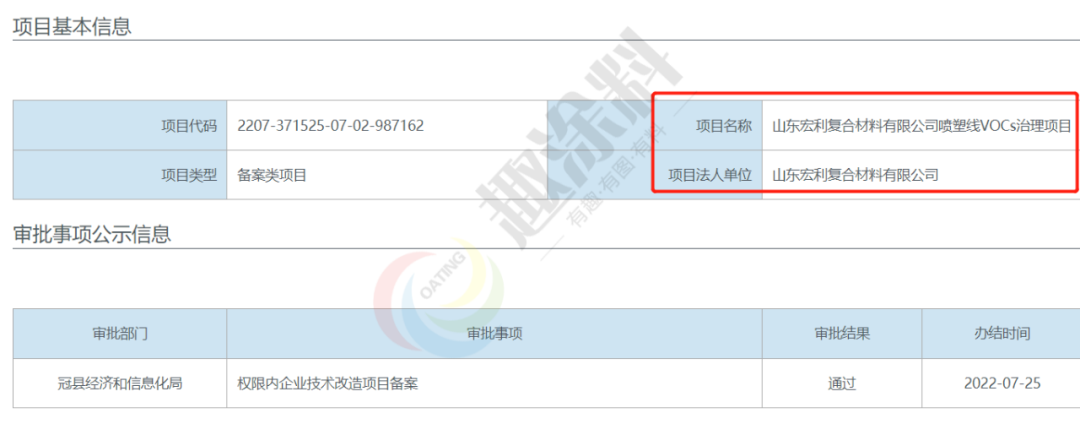 2022年7月25日,山東宏利復(fù)合材料有限公司,噴塑線VOCs治理項(xiàng)目,在冠縣經(jīng)濟(jì)和信息化局,進(jìn)行權(quán)限內(nèi)企業(yè)技術(shù)改造項(xiàng)目備案。