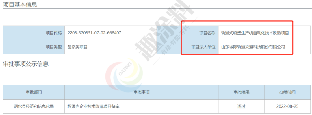 2022年8月25日,山東城際軌道交通科技股份有限公司,軌道式噴塑生產(chǎn)線自動(dòng)化技術(shù)改造項(xiàng)目,在泗水縣經(jīng)濟(jì)和信息化局,進(jìn)行權(quán)限內(nèi)企業(yè)技術(shù)改造項(xiàng)目備案。