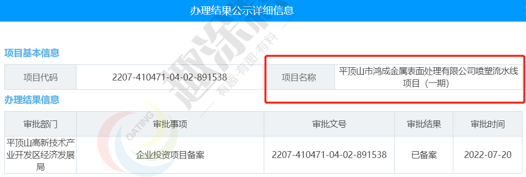 2022年7月20日,平頂山市鴻成金屬表面處理有限公司,噴塑流水線項(xiàng)目(一期),在平頂山高新技術(shù)產(chǎn)業(yè)開(kāi)發(fā)區(qū)經(jīng)濟(jì)發(fā)展局,進(jìn)行企業(yè)投資項(xiàng)目備案。