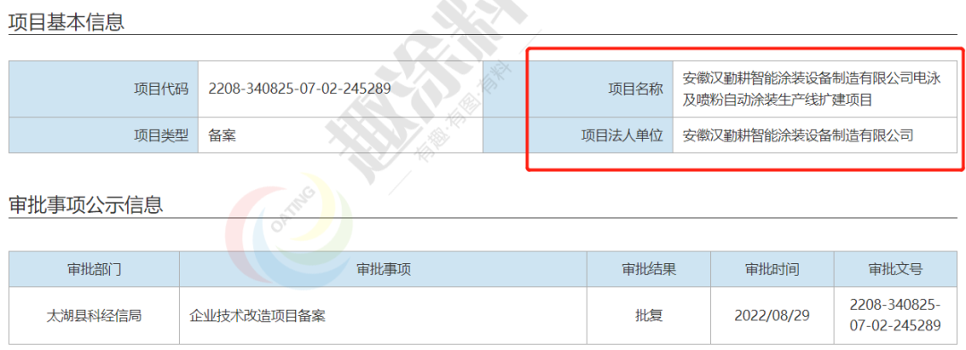 2022年8月29日,安徽漢勤耕智能涂裝設(shè)備制造有限公司,電泳及噴粉自動(dòng)涂裝生產(chǎn)線擴(kuò)建項(xiàng)目,在太湖縣科經(jīng)信局,進(jìn)行企業(yè)技術(shù)改造項(xiàng)目備案。
