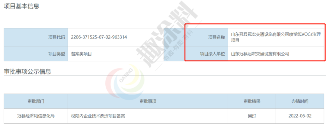 2022年6月2日,冠縣宏達(dá)交通設(shè)施有限公司,噴塑線VOCs治理項(xiàng)目,在冠縣經(jīng)濟(jì)和信息化局,進(jìn)行權(quán)限內(nèi)企業(yè)技術(shù)改造項(xiàng)目備案。