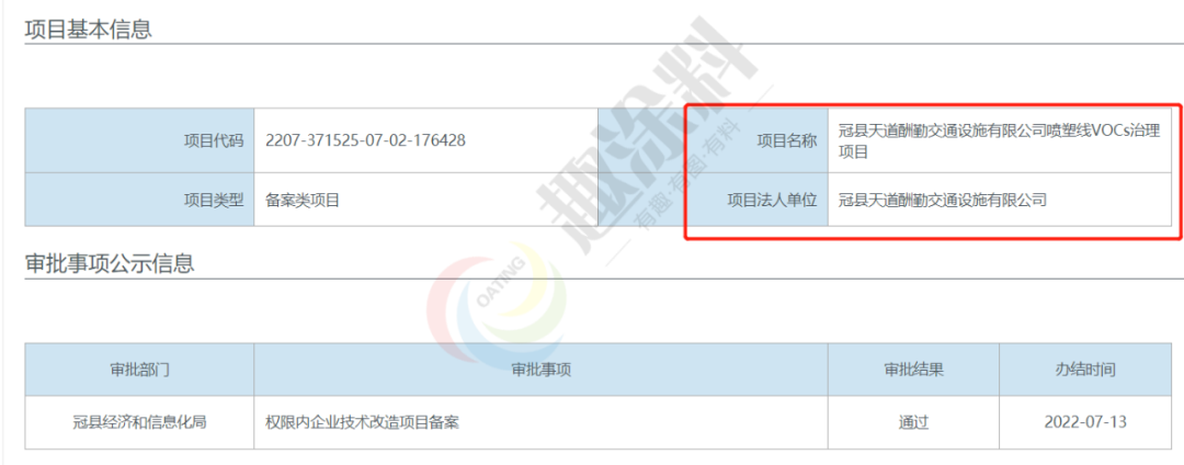 2022年7月13日,冠縣天道酬勤交通設(shè)施有限公司,噴塑線VOCs治理項(xiàng)目,在冠縣經(jīng)濟(jì)和信息化局,進(jìn)行權(quán)限內(nèi)企業(yè)技術(shù)改造項(xiàng)目備案。