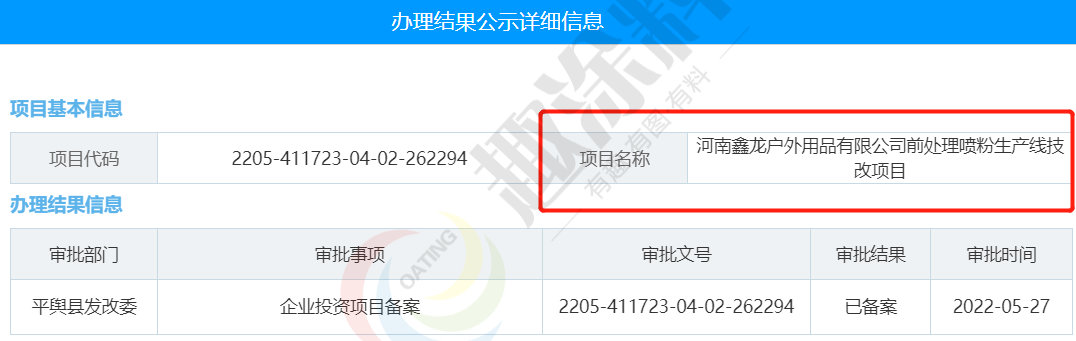 2022年5月27日,河南鑫龍戶外用品有限公司,前處理噴粉生產(chǎn)線技改項(xiàng)目,在平輿縣發(fā)改委,進(jìn)行企業(yè)投資項(xiàng)目備案。