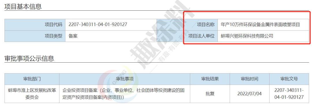 2022年7月4日,蚌埠興馳環(huán)??萍加邢薰?,年產(chǎn)10萬(wàn)件環(huán)保設(shè)備金屬件表面噴塑項(xiàng)目,在蚌埠市淮上區(qū)發(fā)展和改革委員會(huì),進(jìn)行企業(yè)投資項(xiàng)目備案。