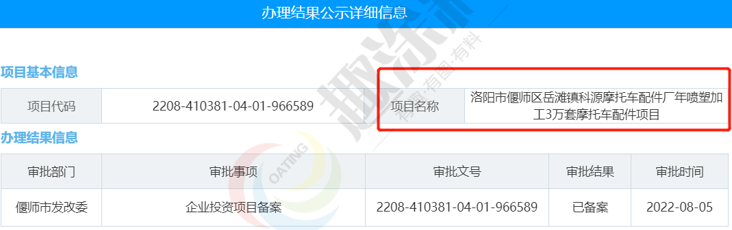 2022年8月5日,洛陽(yáng)市偃師區(qū)岳灘鎮(zhèn)科源摩托車配件廠,年噴塑加工3萬(wàn)套摩托車配件項(xiàng)目,在偃師市發(fā)改委,進(jìn)行企業(yè)投資項(xiàng)目備案。