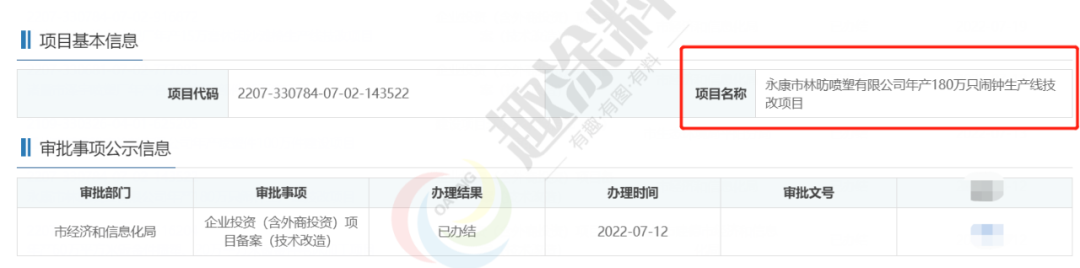 2022年7月12日,永康市林昉噴塑有限公司,年產(chǎn)180萬(wàn)只鬧鐘生產(chǎn)線技改項(xiàng)目,在市經(jīng)濟(jì)和信息化局,進(jìn)行企業(yè)投資(含外商投資)項(xiàng)目備案(技術(shù)改造)。