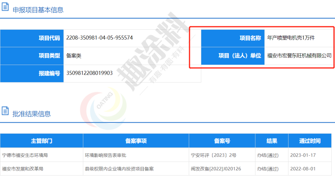 2022年8月1日,福安市宏譽(yù)東旺機(jī)械有限公司,年產(chǎn)噴塑電機(jī)殼1萬(wàn)件,在福安市發(fā)展和改革局,進(jìn)行縣級(jí)權(quán)限內(nèi)企業(yè)境內(nèi)投資項(xiàng)目備案。