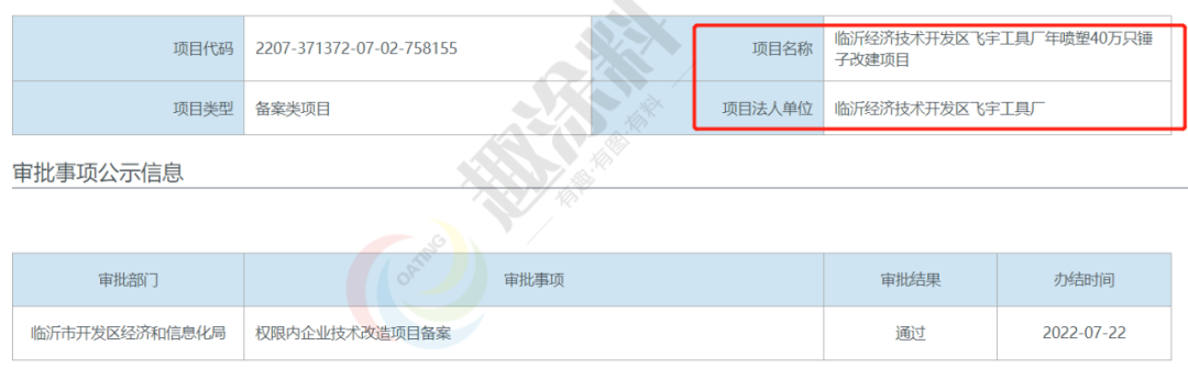 2022年7月22日,臨沂經(jīng)濟(jì)技術(shù)開(kāi)發(fā)區(qū)飛宇工具廠,年噴塑40萬(wàn)只錘子改建項(xiàng)目,在臨沂市開(kāi)發(fā)區(qū)經(jīng)濟(jì)和信息化局,進(jìn)行權(quán)限內(nèi)企業(yè)技術(shù)改造項(xiàng)目備案。