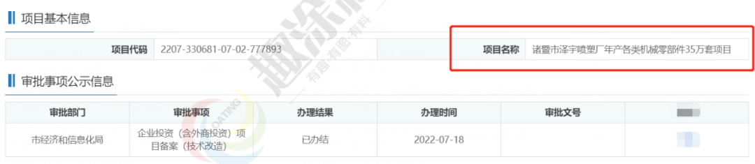 2022年7月18日,諸暨市澤宇噴塑廠,年產(chǎn)各類機(jī)械零部件35萬(wàn)套項(xiàng)目,在市經(jīng)濟(jì)和信息化局,進(jìn)行企業(yè)投資(含外商投資)項(xiàng)目備案(技術(shù)改造)。