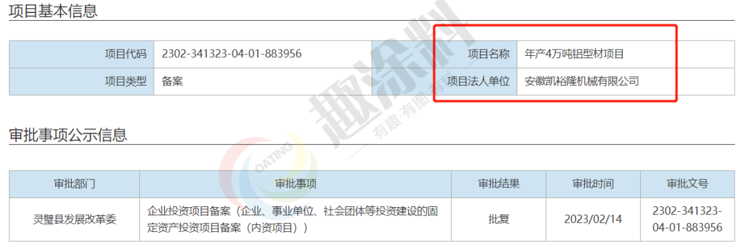 2023年2月14日,安徽凱裕隆機(jī)械有限公司,年產(chǎn)4萬噸鋁型材項(xiàng)目,在靈璧縣發(fā)展改革委,進(jìn)行企業(yè)投資項(xiàng)目備案。