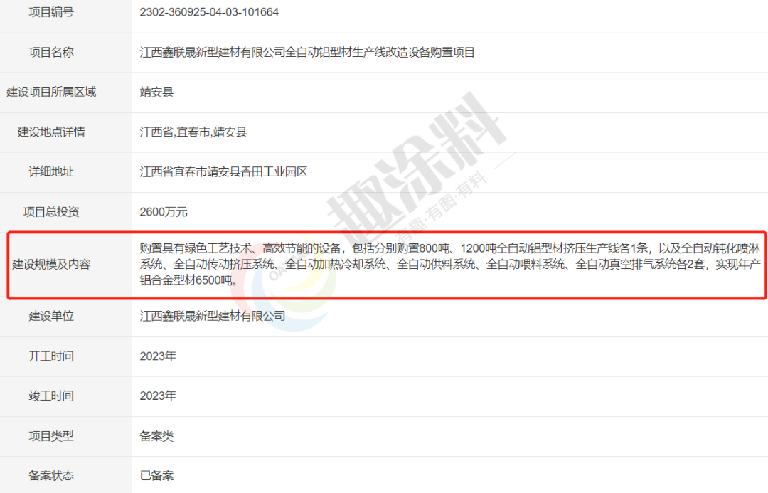 2023年2月14日,江西鑫聯(lián)晟新型建材有限公司,全自動鋁型材生產(chǎn)線改造設(shè)備購置項(xiàng)目,進(jìn)行企業(yè)項(xiàng)目備案。