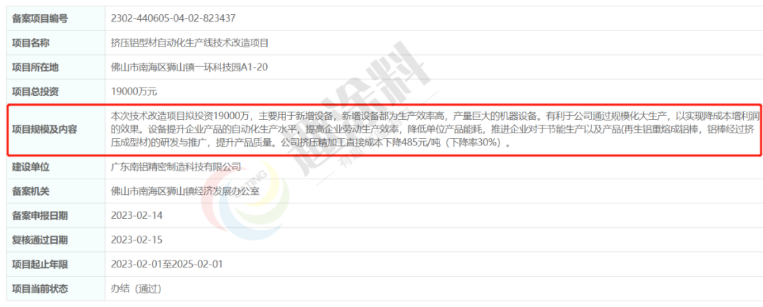 2023年2月15日,廣東南鋁精密制造科技有限公司,擠壓鋁型材自動化生產(chǎn)線技術(shù)改造項(xiàng)目,在佛山市南海區(qū)獅山鎮(zhèn)經(jīng)濟(jì)發(fā)展辦公室,進(jìn)行企業(yè)項(xiàng)目備案。