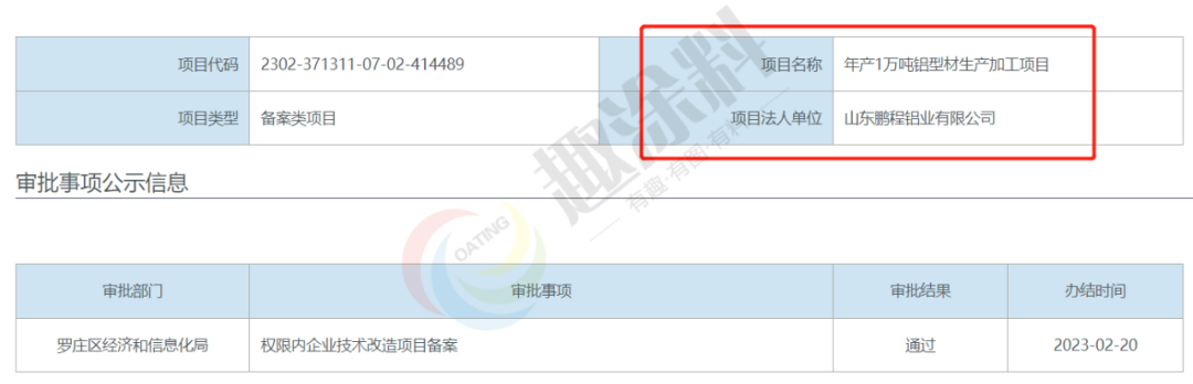 2023年2月20日,山東鵬程鋁業(yè)有限公司,年產(chǎn)1萬噸鋁型材生產(chǎn)加工項(xiàng)目,在羅莊區(qū)經(jīng)濟(jì)和信息化局,進(jìn)行權(quán)限內(nèi)企業(yè)技術(shù)改造項(xiàng)目備案。