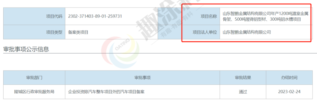 2023年2月23日,山東智鵬金屬結(jié)構(gòu)有限公司,年產(chǎn)1200噸溫室金屬骨架、500噸屋脊鋁型材、300噸鋁水槽項(xiàng)目,在陵城區(qū)行政審批服務(wù)局,進(jìn)行企業(yè)投資除汽車整車項(xiàng)目外的汽車項(xiàng)目備案。
