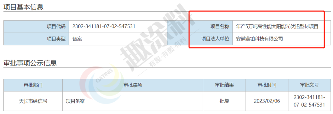 2023年2月6日,安徽鑫鉑科技有限公司,年產(chǎn)5萬噸高性能太陽能光伏鋁型材項(xiàng)目,在天長市經(jīng)信局,進(jìn)行項(xiàng)目備案。