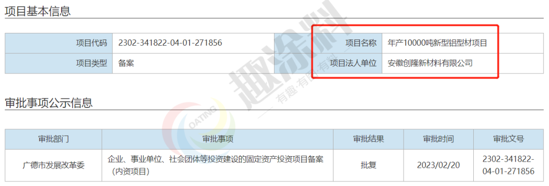 2023年2月20日,安徽創(chuàng)隆新材料有限公司,年產(chǎn)10000噸新型鋁型材項(xiàng)目,在廣德市發(fā)展改革委,進(jìn)行企業(yè)、事業(yè)單位、社會團(tuán)體等投資建設(shè)的固定資產(chǎn)投資項(xiàng)目備案(內(nèi)資項(xiàng)目)。
