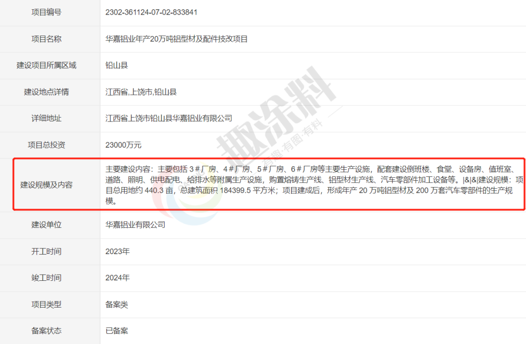 2023年2月13日,華嘉鋁業(yè)有限公司,年產(chǎn)20萬噸鋁型材及配件技改項(xiàng)目,進(jìn)行企業(yè)項(xiàng)目備案。