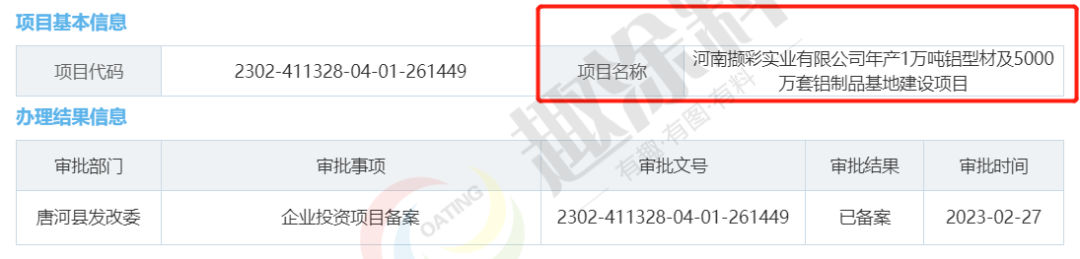 2023年2月27日,河南擷彩實(shí)業(yè)有限公司,年產(chǎn)1萬噸鋁型材及5000萬套鋁制品基地建設(shè)項(xiàng)目,在唐河縣發(fā)改委,進(jìn)行企業(yè)投資項(xiàng)目備案。