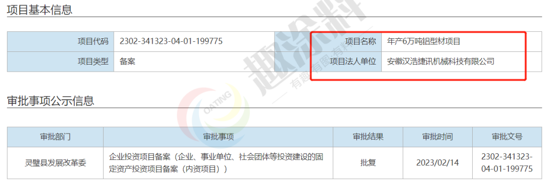 2023年2月14日,安徽漢浩捷訊機(jī)械科技有限公司,年產(chǎn)6萬噸鋁型材項(xiàng)目,在靈璧縣發(fā)展改革委,進(jìn)行企業(yè)投資項(xiàng)目備案。