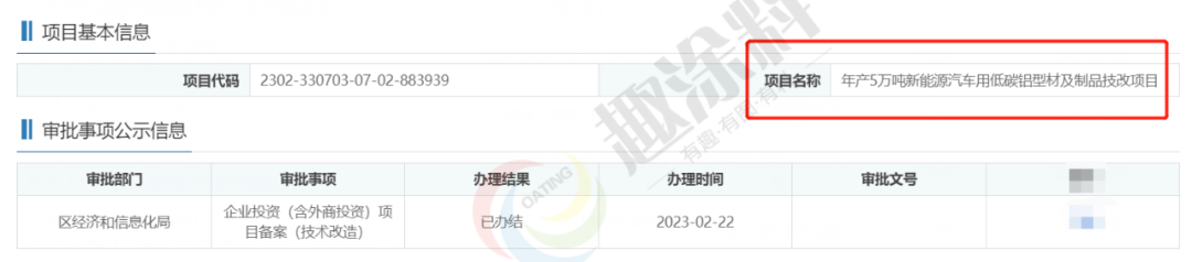 2023年2月22日,浙江今飛摩輪有限公司,年產(chǎn)5萬噸新能源汽車用低碳鋁型材及制品技改項(xiàng)目,在區(qū)經(jīng)濟(jì)和信息化局,進(jìn)行企業(yè)投資(含外商投資)項(xiàng)目備案(技術(shù)改造)。