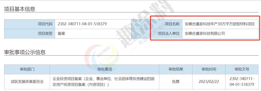 2023年2月22日,安徽合喜家科技有限公司,年產(chǎn)30萬平方鋁型材料項(xiàng)目,在郊區(qū)發(fā)展改革委員會,進(jìn)行企業(yè)投資項(xiàng)目備案。