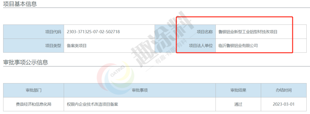 2023年2月28日,臨沂魯銀鋁業(yè)有限公司,新型工業(yè)鋁型材技改項(xiàng)目,在費(fèi)縣經(jīng)濟(jì)和信息化局,申請進(jìn)行權(quán)限內(nèi)企業(yè)技術(shù)改造項(xiàng)目備案。