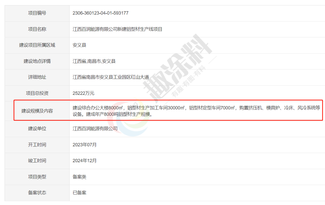 2023年7月11日,江西百潤能源有限公司,新建鋁型材生產(chǎn)線項(xiàng)目,進(jìn)行企業(yè)項(xiàng)目備案。
