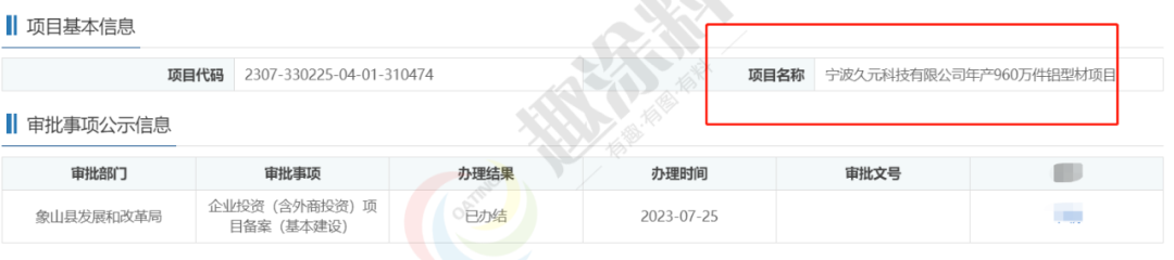 2023年7月25日,寧波久元科技有限公司,年產(chǎn)960萬件鋁型材項(xiàng)目,在象山縣發(fā)展和改革局,進(jìn)行企業(yè)投資(含外商投資)項(xiàng)目備案(基本建設(shè))。