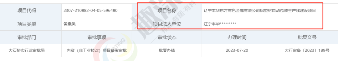 2023年7月20日,遼寧豐華東方有色金屬有限公司,鋁型材自動(dòng)包裝生產(chǎn)線建設(shè)項(xiàng)目,在大石橋市行政審批局,進(jìn)行內(nèi)資(非工業(yè)技改)項(xiàng)目備案審批。