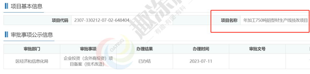 2023年7月11日,寧波豪太鋁業(yè)有限公司,年加工750噸鋁型材生產(chǎn)線技改項(xiàng)目,在區(qū)經(jīng)濟(jì)和信息化局,進(jìn)行企業(yè)投資(含外商投資)項(xiàng)目備案(技術(shù)改造)。