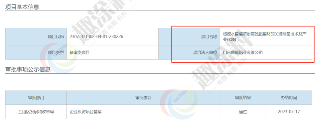 2023年7月17日,山東魯昌鋁業(yè)有限公司,超疏水自清潔耐腐蝕鋁型材的關(guān)鍵制備技術(shù)及產(chǎn)業(yè)化項(xiàng)目,在蘭山區(qū)發(fā)展和改革局,進(jìn)行企業(yè)投資項(xiàng)目備案。