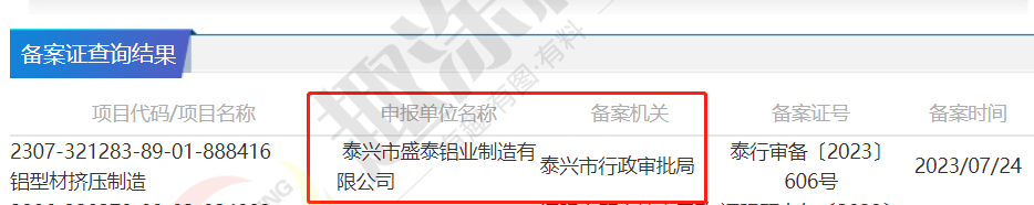 2023年7月24日,泰興市盛泰鋁業(yè)制造有限公司,鋁型材擠壓制造,在泰興市行政審批局,進(jìn)行企業(yè)項(xiàng)目備案。