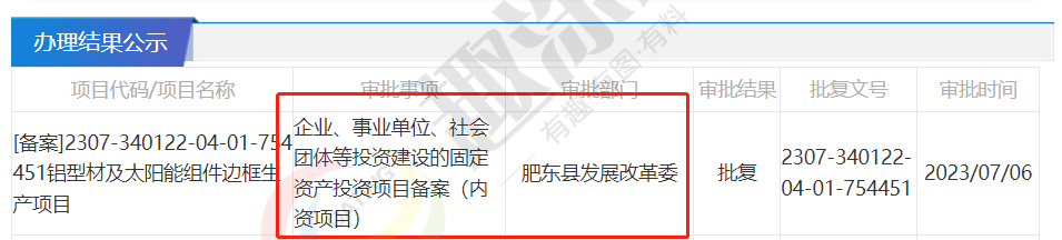 2023年7月6日,合肥市晶科光伏材料有限公司,鋁型材及太陽能組件邊框生產(chǎn)項(xiàng)目,在肥東縣發(fā)展改革委,進(jìn)行企業(yè)項(xiàng)目備案。
