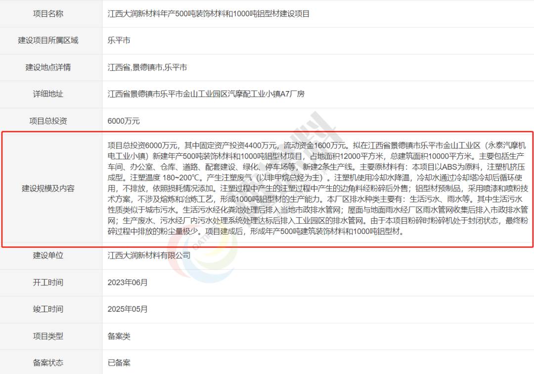 2023年7月14日,江西大潤新材料有限公司,年產(chǎn)500噸裝飾材料和1000噸鋁型材建設(shè)項(xiàng)目,進(jìn)行企業(yè)項(xiàng)目備案。