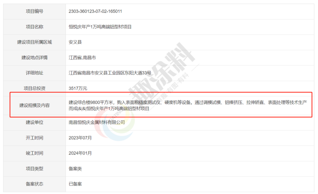 2023年7月20日,南昌恒悅慶金屬材料有限公司,年產(chǎn)1萬噸高端鋁型材項(xiàng)目,進(jìn)行企業(yè)項(xiàng)目備案。
