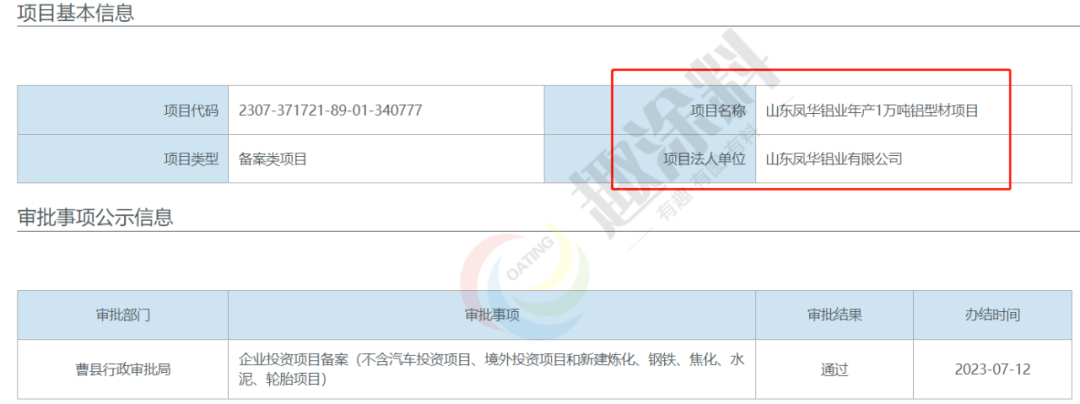 2023年7月12日,山東鳳華鋁業(yè)有限公司,年產(chǎn)1萬噸鋁型材項(xiàng)目,在曹縣行政審批局,進(jìn)行企業(yè)投資項(xiàng)目備案(不含汽車投資項(xiàng)目、境外投資項(xiàng)目和新建煉化、鋼鐵、焦化、水泥、輪胎項(xiàng)目)。