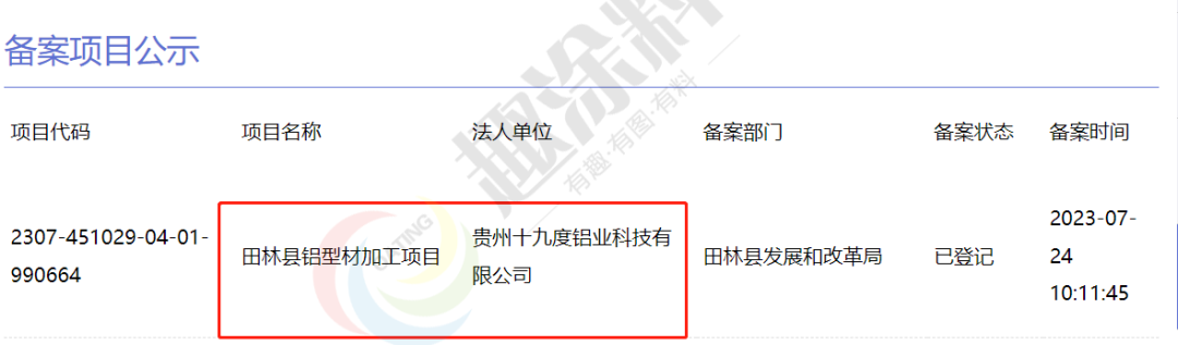 2023年7月24日,貴州十九度鋁業(yè)科技有限公司,田林縣鋁型材加工項(xiàng)目,在田林縣發(fā)展和改革局,進(jìn)行企業(yè)項(xiàng)目備案。