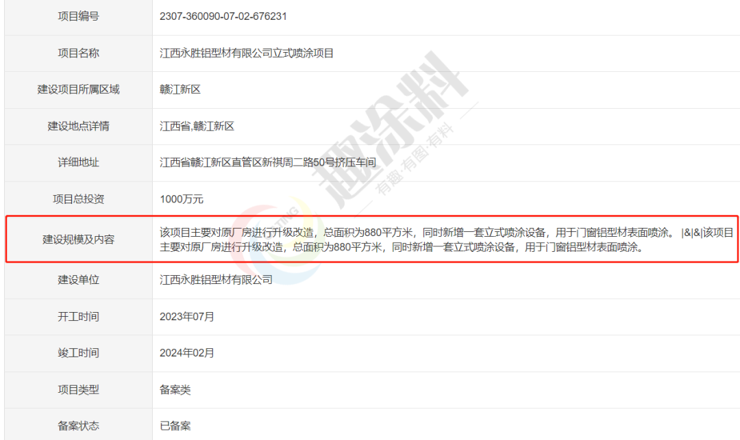 2023年7月24日,江西永勝鋁型材有限公司,立式噴涂項(xiàng)目,進(jìn)行企業(yè)項(xiàng)目備案。